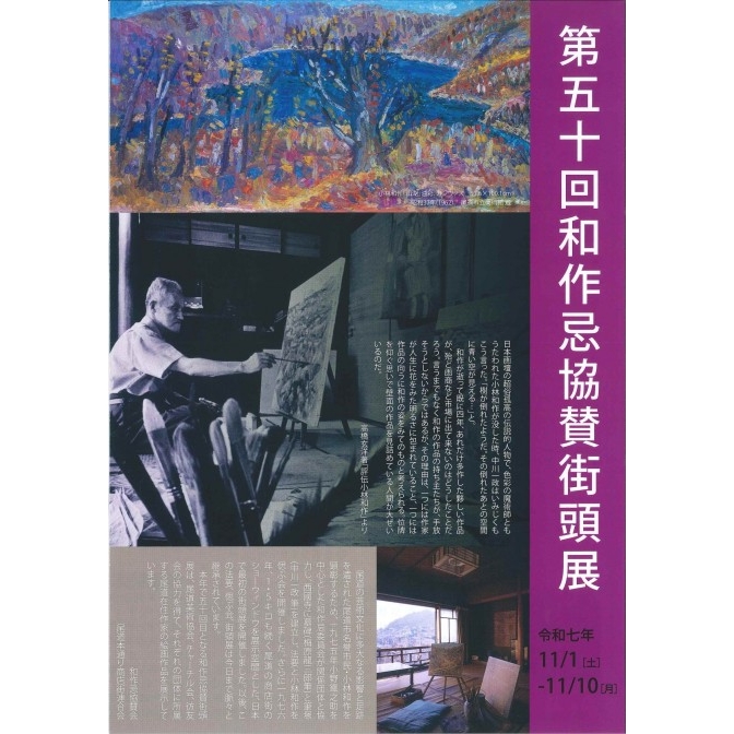 内容 | 尾道市名誉市民であり、洋画家の小林和作の命日(11月4日)前後の10日間、彼の功績を顕彰するために行われる街頭展。 商店街のウィンドウに和作の作品をはじめ、彼の薫陶を受け継ぐ尾道在住の洋画家団体の会員らによる作品が展示されます。 |