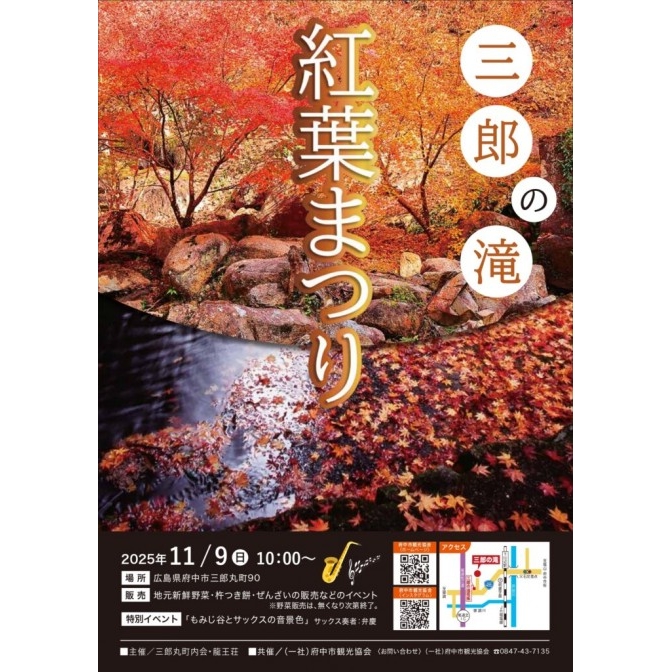 内容 | 釣った魚をその場で焼いて食べることができるマス釣りや地元新鮮野菜、杵つき餅、ぜんざいの販売など。滝の宿ではおでんやうどんを提供しています。 また、今年はもみじ谷に響くサックスの演奏をお楽しみいただけます。 簡単なアンケートに答えていただいた方には賞品を差し上げます |