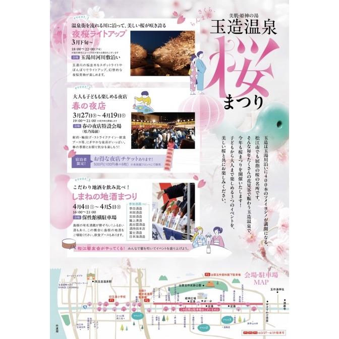 | 内容 | 玉造は玉湯川沿いに400本のソメイヨシノが満開になる、松江市でも屈指の桜の名所。毎年たくさんの花見客でにぎわう玉造温泉で、今年も桜まつりが開催されます。 子どもから大人まで楽しめる3つのイベントを美しい桜と共にお楽しみください。 ◎夜桜ライトアップ 3/20(金)~ 18:00~22:00予定 会場:玉湯川河川敷沿い ◎春の夜店 3/27(金)~4/19(日) 19:00~21:00予定 会場:夜店特設会場(松乃湯斜め前駐車場スペース) 内容:射的や輪投げなど大人も子供も楽しめる夜店 生ビールや焼きそば、イカ焼き、フランクフルトなども。 【宿泊者限定!お得な夜店チケット】 500円(100円券×6枚) 各旅館フロントにて販売。 ◎しまねの地酒まつり 4/4(土)、4/5(日) 16:00~21:00予定 期間中は臨時駐車場をご用意しておりますが、 台数に限りがございますので、予めご了承ください。 |