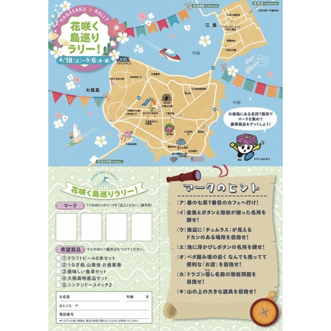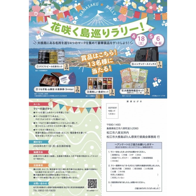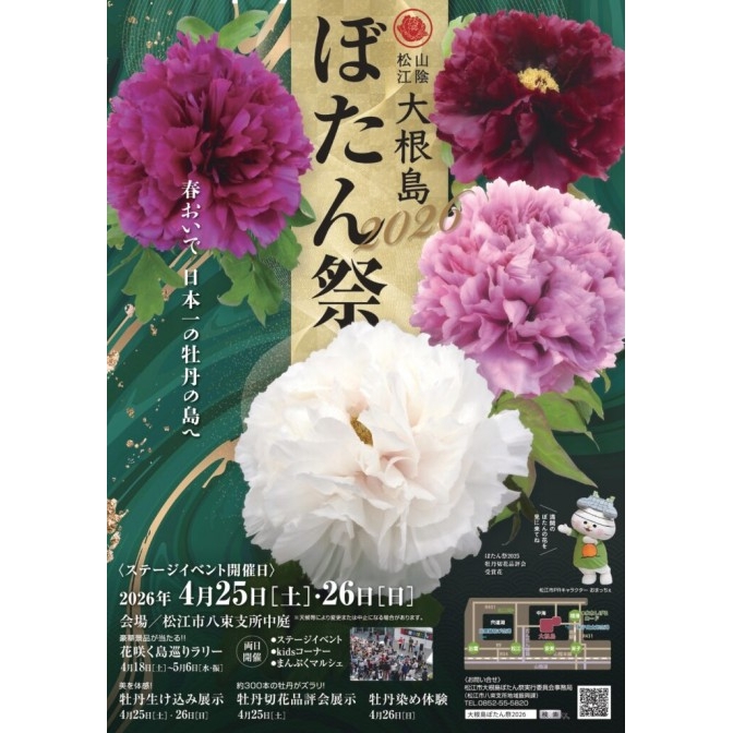 | 内容 | 日本一の牡丹の島、大根島が、特産の「牡丹の花」で彩られるお祭りです。 ◇ステージイベント 4/25、4/26 ◇大型牡丹生け込み展示 ◇まんぷくマルシェ ◇大根島まんなかマーケット ◇kidsコーナー ◇牡丹切花品評会展示(4/25) ◇牡丹染め体験(4/26) ◇ぼたんウォーク(4/26) ◇花咲く島めぐりラリー 4/18~5/6 大根島・江島の名所に設置されたマークを応募用紙に記入して応募すると豪華賞品が抽選で当たります! |