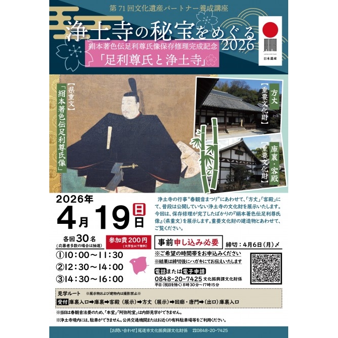 | 内容 | 広島県重要文化財「絹本著色伝足利尊氏像」の修理完了を記念し、特別公開を開催! 浄土寺に伝わる尊氏ゆかりの品々とともに、普段は見ることのできない秘宝をご覧いただけます。 歴史ある重要文化財の建造物で、特別なひとときをぜひお楽しみください。 |