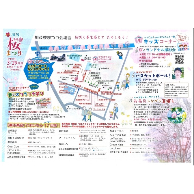 | 内容 | 島根県雲南市には桜の名所が数多くありますが、この桜まつりは中村川をはじめとする加茂地区の桜祭りです。 地元の子供たちによるステージや体験イベント、宝さがしなど子供と一緒に楽しめるイベントが盛りだくさんです。 |