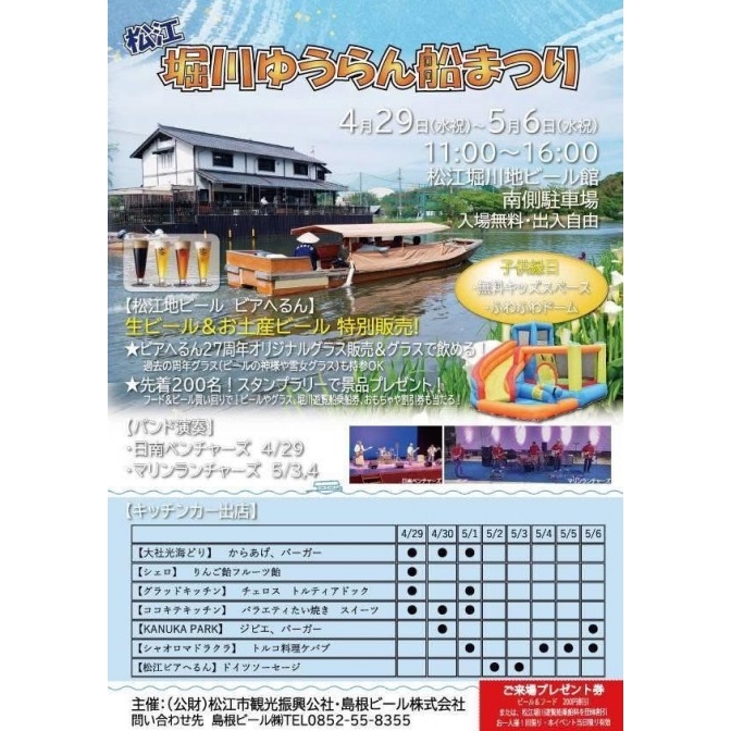 | 内容 | GW中に松江の春を楽しめる「堀川ゆうらん船まつり」が開催されます。 松江地ビール「ビアへるん」の生ビールやお土産ビールを特別販売するほか、キッチンカーも出店しバラエティ豊かな味が楽しめます。 音楽ライブなどのステージイベントも行われます(4/29、5/3、5/4) 地ビール館も休憩室として無料開放されており、食事や散策の合間に気軽にゆっくり休むことも。 ぜひご家族や友人とお出かけください。 |